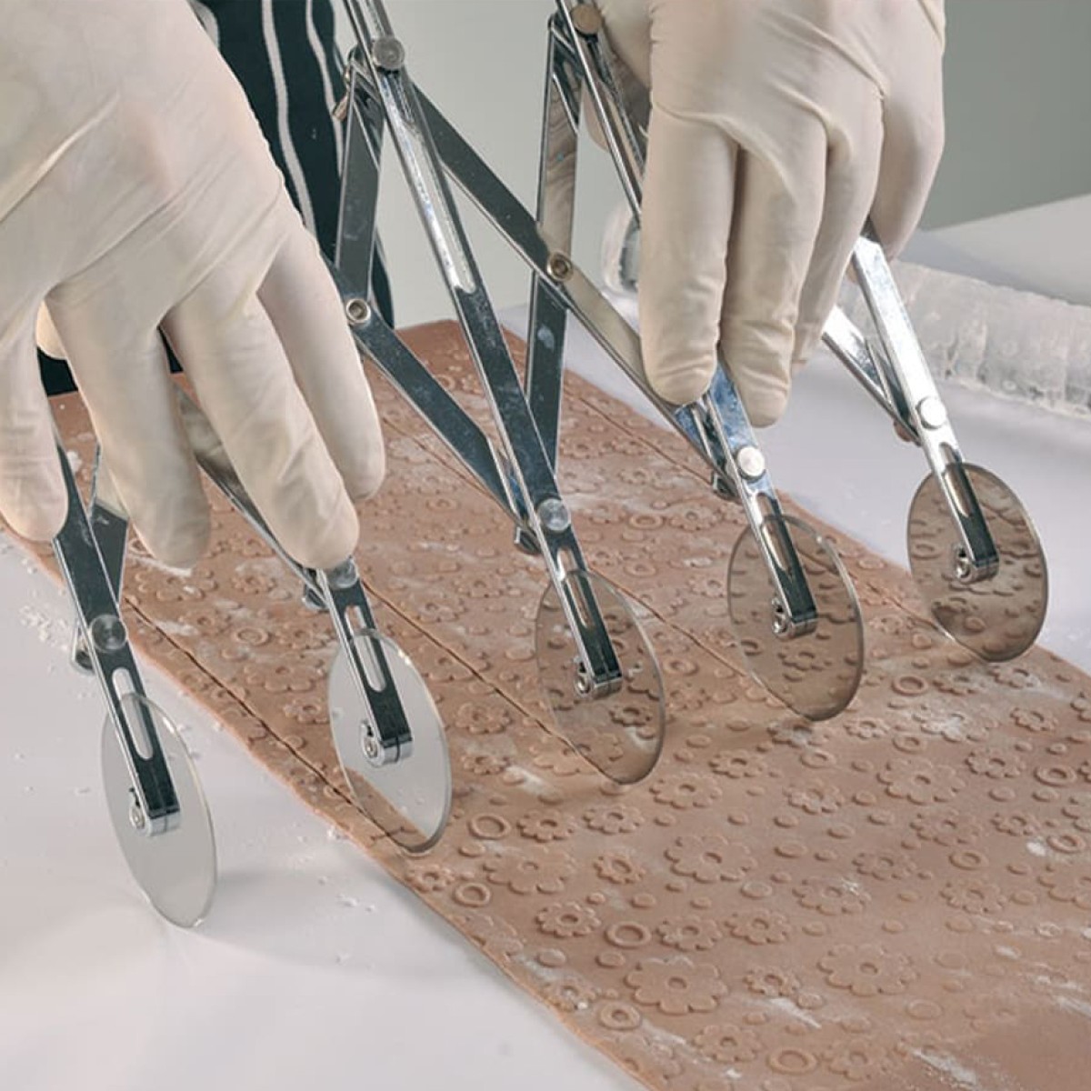 Спестете време и усилия с раздвижения нож с 5 колела.  Той е идеален за рязане на сладки, бисквити, сладкиши и всякакви тестени изделия. Изработен е от неръждаема стомана и е италиански продукт, което гарантира високо качество. Разполага с заключващ механизъм, който позволява да регулирате с максимална точност начина на рязане и същевременно да постигнете равномерни и прецизни резултати.