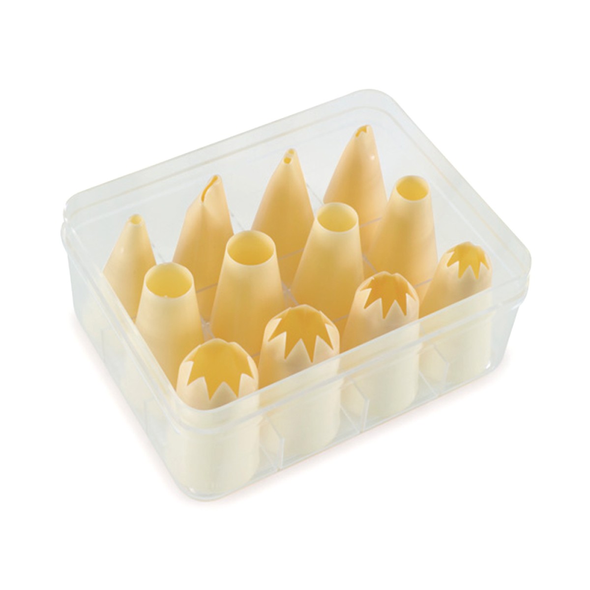 Комплект, състоящ се от 12 различни малки пластмасови накрайници в практична пластмасова кутия за удобно транспортиране.