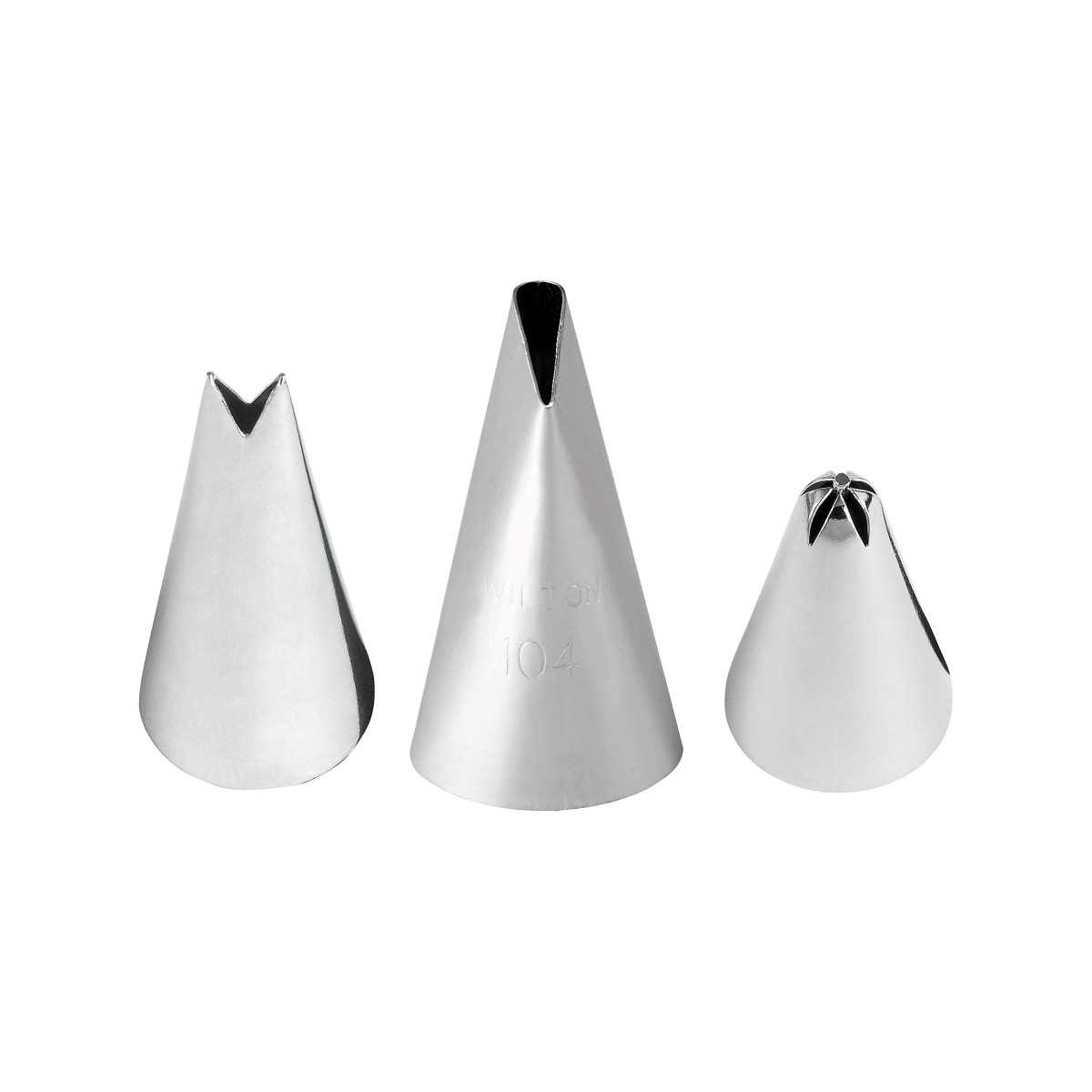 Комплект от три накрайника. Изключително качествени. Преди и след всяка употреба е препоръчичтелно да ги измиете с топла вода. Може да се мият в съдомиялна. С тези накрайници се работи лесно – само с лек натиск върху поша създавате красиви цветя и декорации за вашата торта, бисквити, кремове, сладолед, сладкиши, мъфини и други. Съвместими са с всички пошове за еднократна употреба. Нужно е само да отрежете малко от върха на поша.