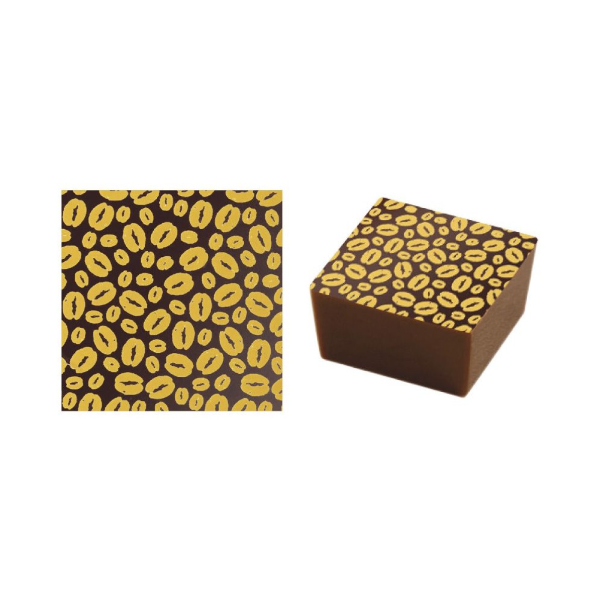 Разнесете разтопен шоколад върху лист трансферно фолио. Оставете да стегне на 6°C за поне 20 минути преди да отлепите шарката.
