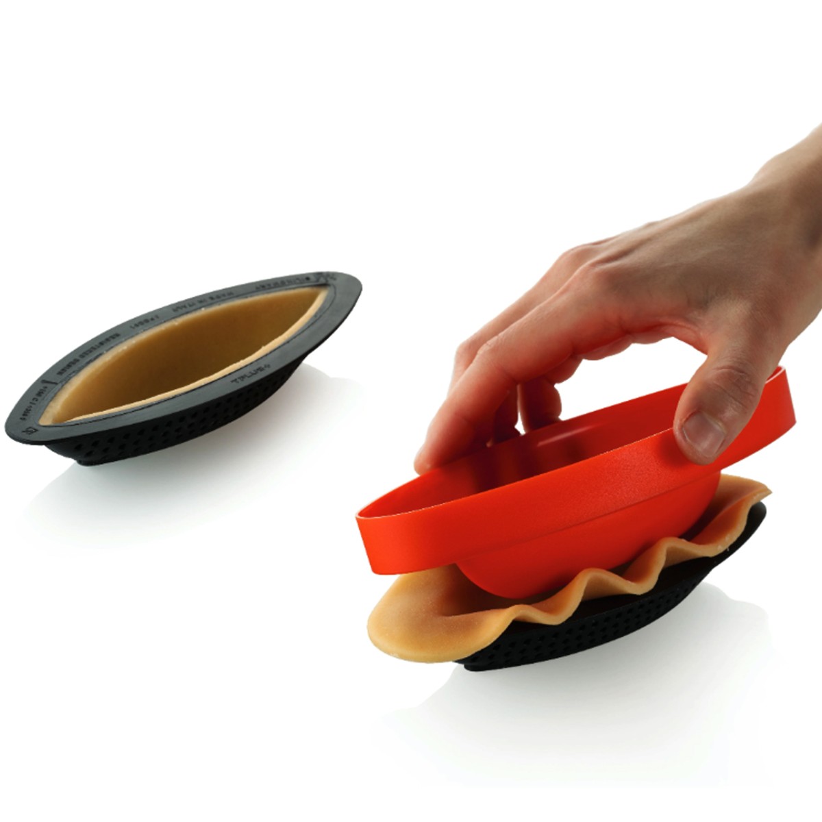 Комплектът ви позволява да създавате елегантни тарталети във формата на ценния плод Кабоса! Комплектът се състои от три елемента: силиконова форма с шест вдлъбнатини за създаване на горната част, шест тарт ринга за изработване на 3D основи от маслено тесто и нож за оформяне, който изрязва тестото и му помага да залепне перфектно към ринговете, ускорявайки процеса на приготвяне. Създаден с Carmine Di Donna. Могат да бъдат използвани за печене и замразяване. Идеални са за професионална употреба в сладкарството, производството на сладолед и Хорека. Гарантирани са над 3000 ползвания и след употреба може да бъде измита в съдомиялна машина.